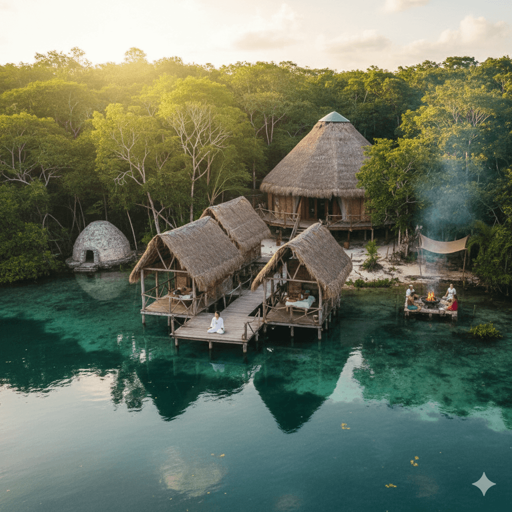Akalki es un santuario frente a la Laguna de Bacalar donde retiros, naturaleza y sanación se unen para ofrecer una experiencia profunda de bienestar y conexión.